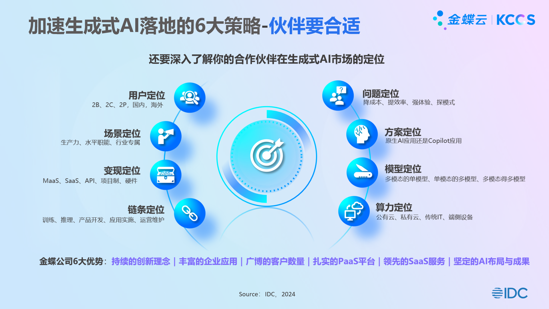 结合上面这个状况来讲,我们选择合作伙伴的时候需要深入了解你的合作伙伴在生成式AI市场的定位以及和您的需要点是不是一样。其中就包含用户、场景、变现、链条、问题、方案、模型、算力这八个定位,这也是行业用户选择伙伴非常重要的因素。