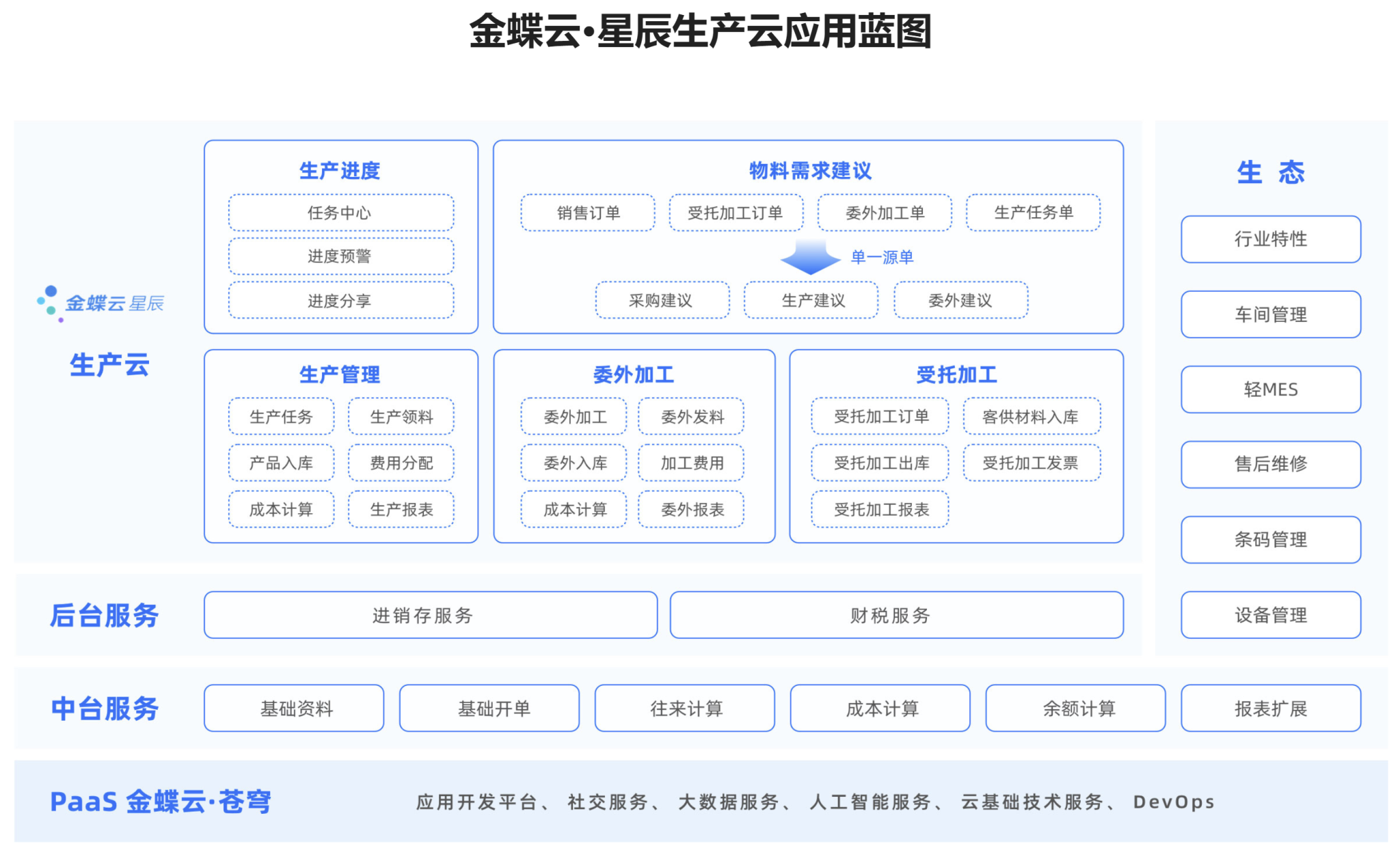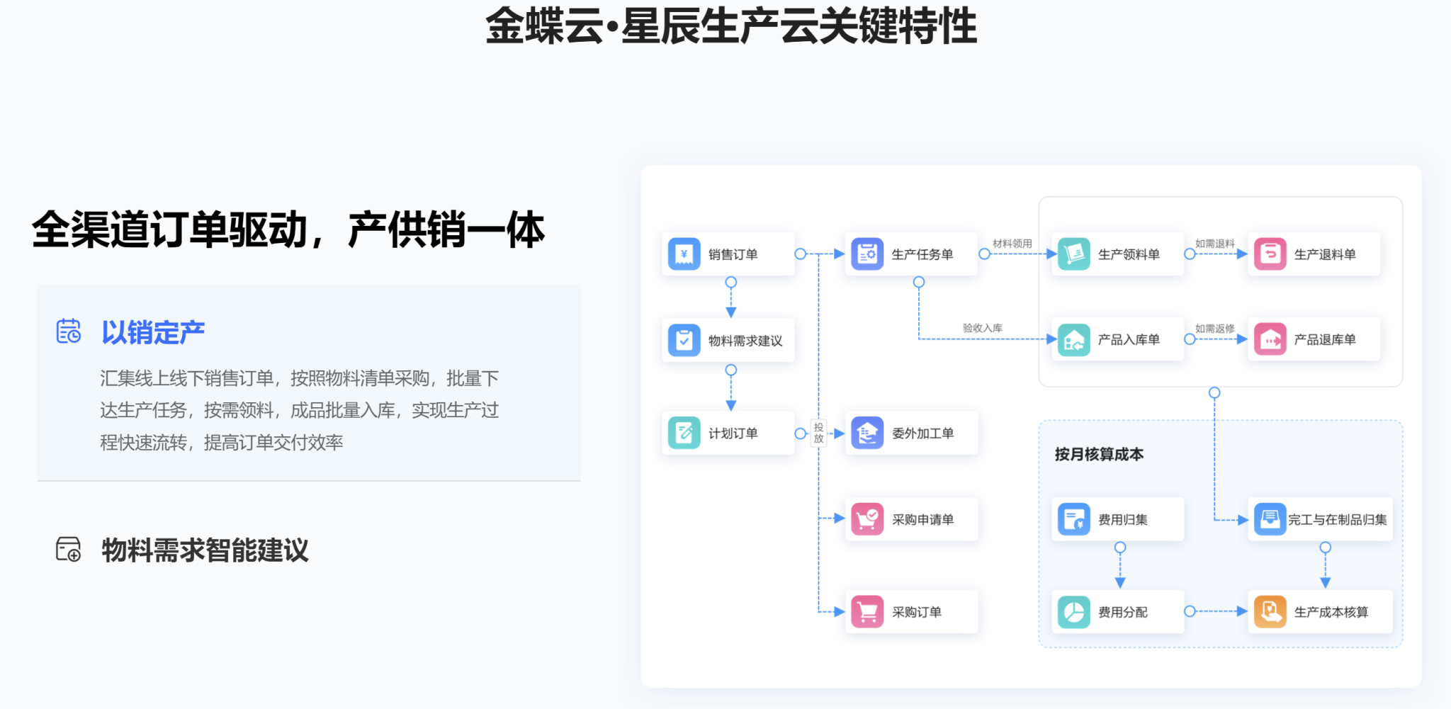 金蝶云·星辰生产云面向小型工贸企业的生产、仓库、财务、采购等管理人员,提供以销售订单为源头的全业务流程的数字化管控
