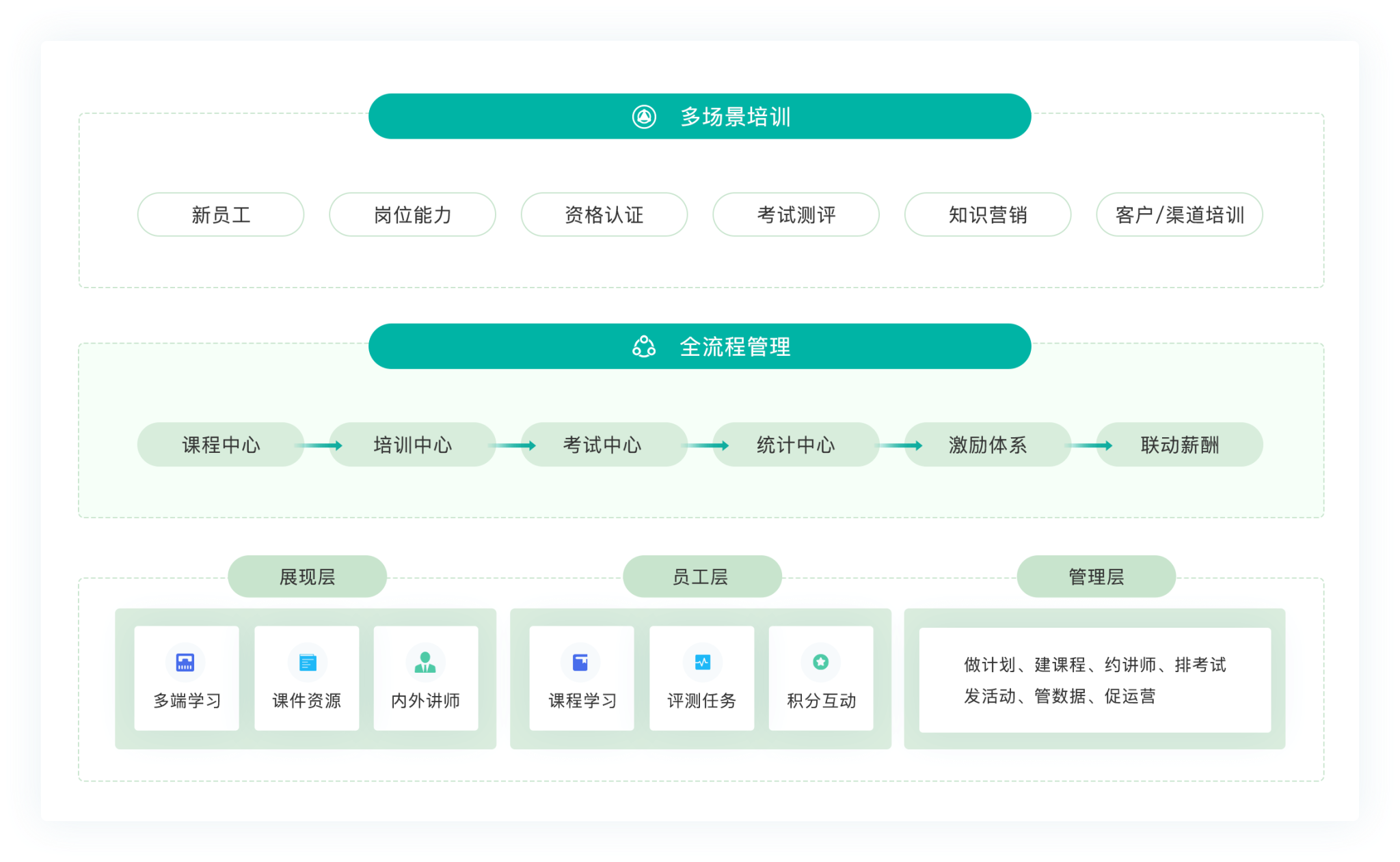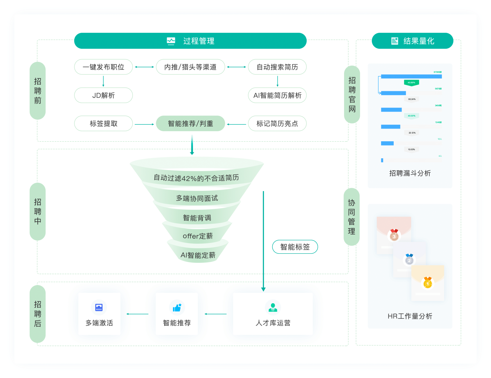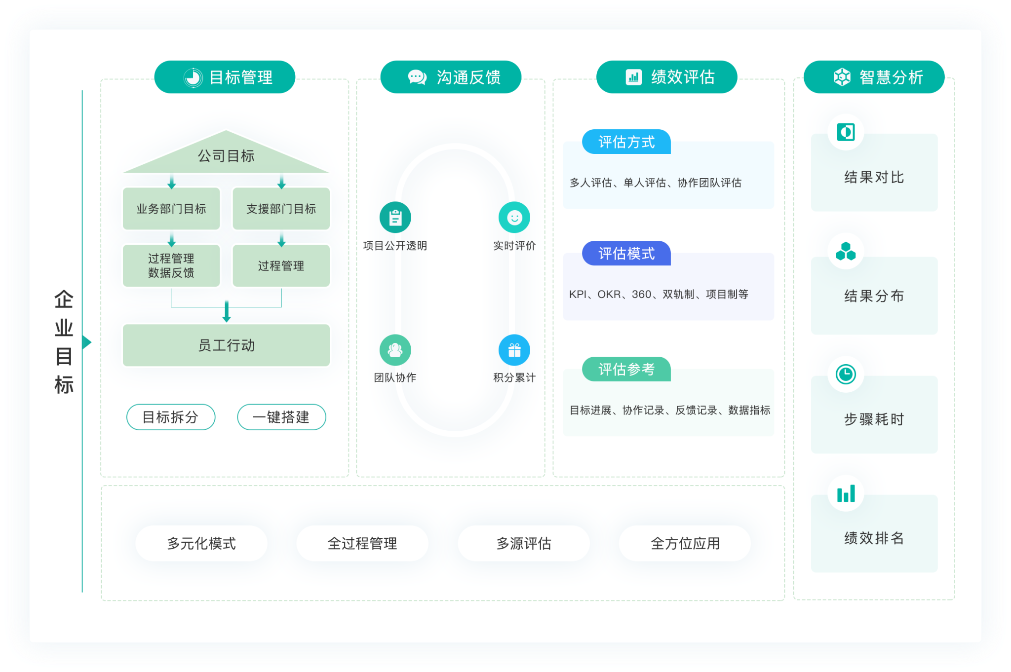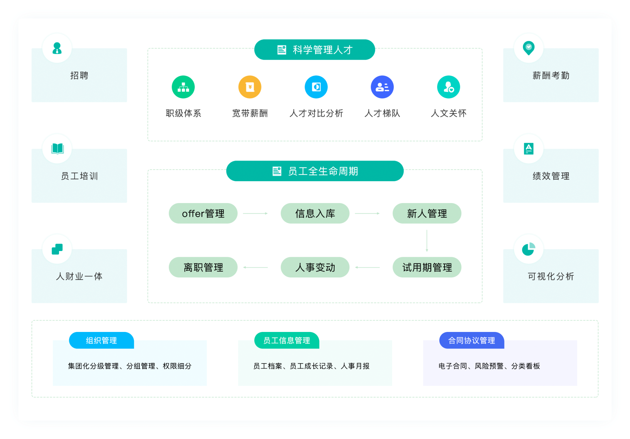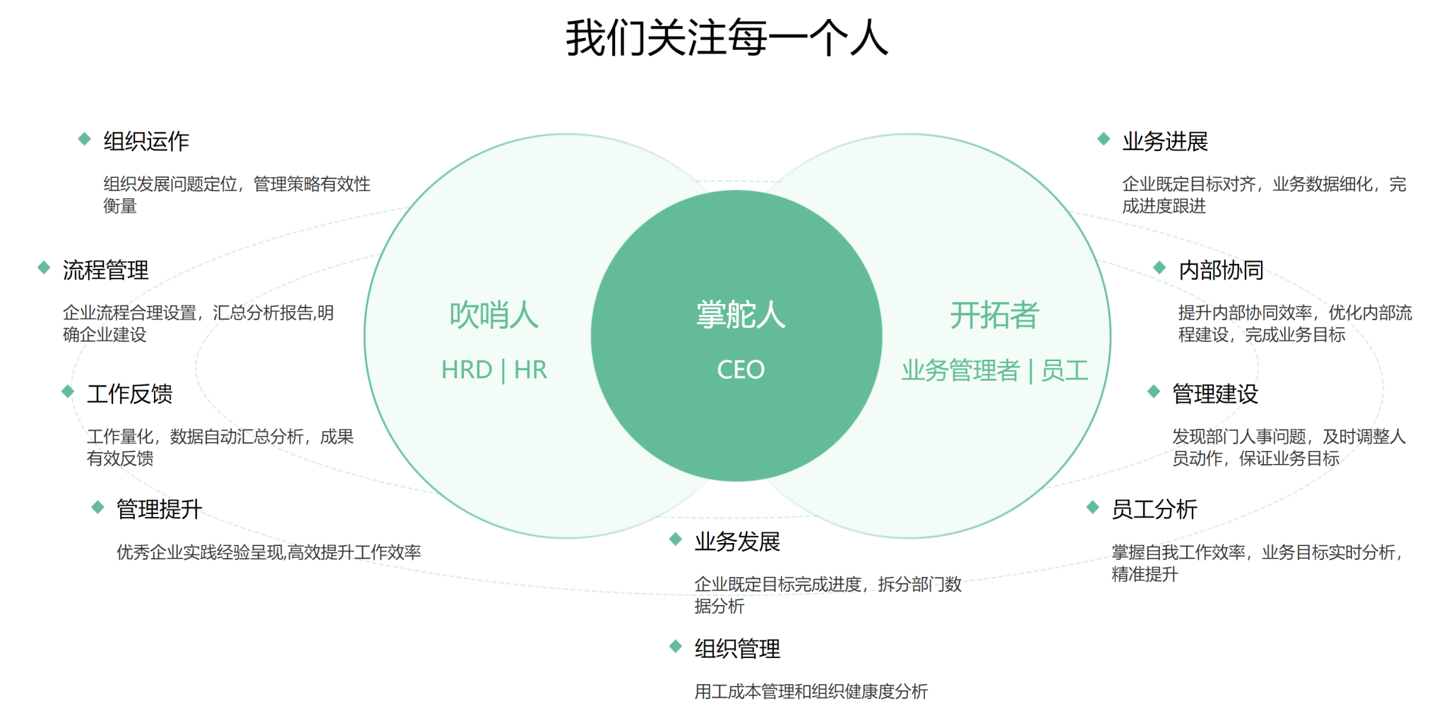 同时,系统运用机器学习、大数据和区块链等高科技手段,科学构建企业、组织、员工三层效率模型,结合“人力+财务+业务”多个工作场景,建立智能数据中心,通过数据建模、模型诊断、选择最佳实践等手段,实现以业务精化循环为基础的企业科学管理,全面提升协作效率,组织建设效率和个人价值转化效率,达成提高人效的目的。