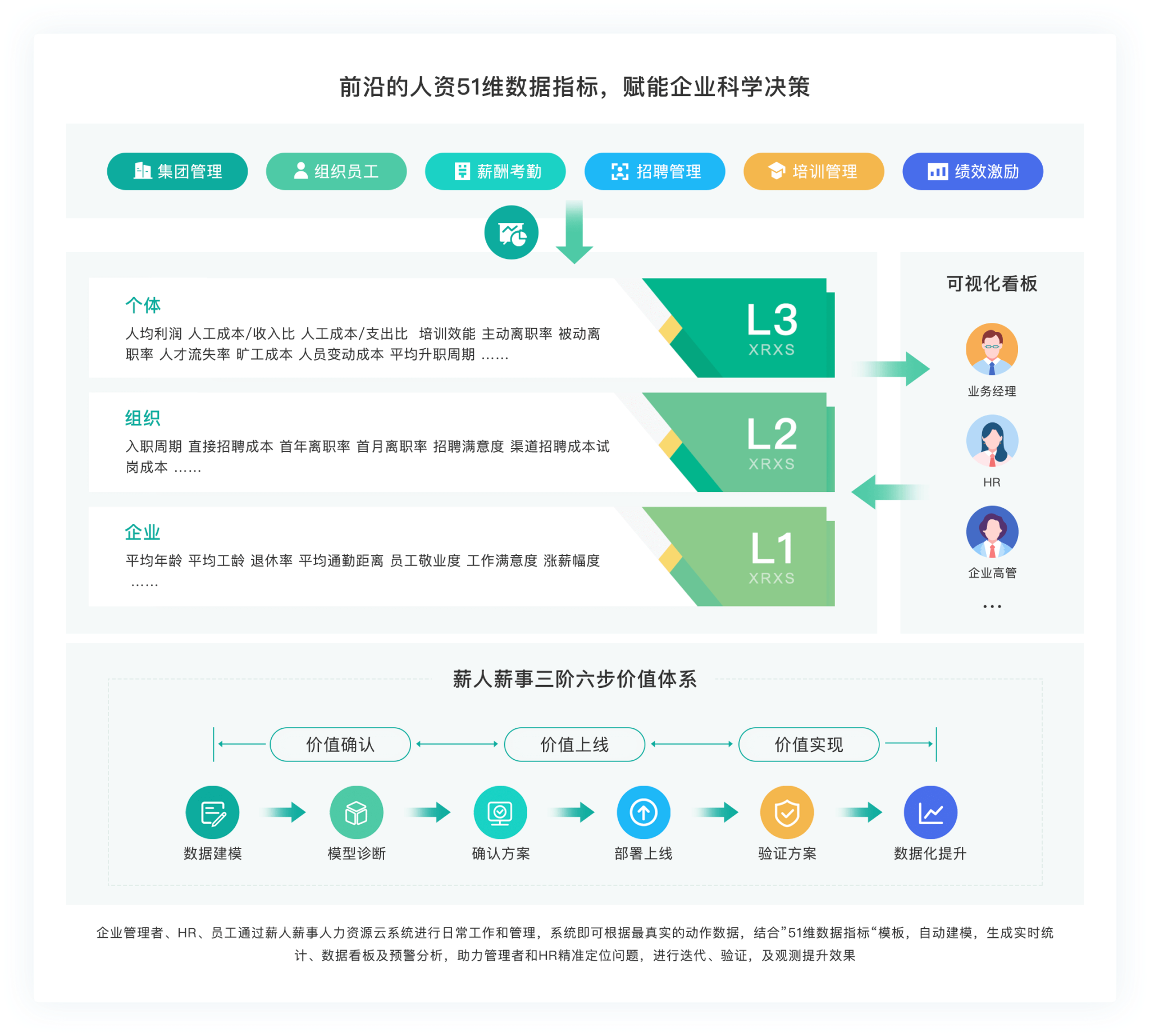 人力资源战略系统化落地,是解决业务问题的根源。通过51维数据指标,薪人薪事帮助HR洞察、优化、驱动人力资源业务,落地人力资源战略,让人力资源成为企业核心竞争力